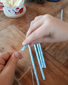 Fädelt die zurechtgeschnittenen Strohhalme anschließend auf den Faden und bindet die Enden zum Schluss mit einem Knoten zusammen. Wichtig ist, dass die Halme dicht aneinander liegen und keine großen Lücken entstehen.