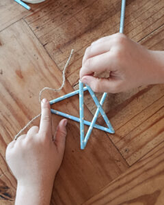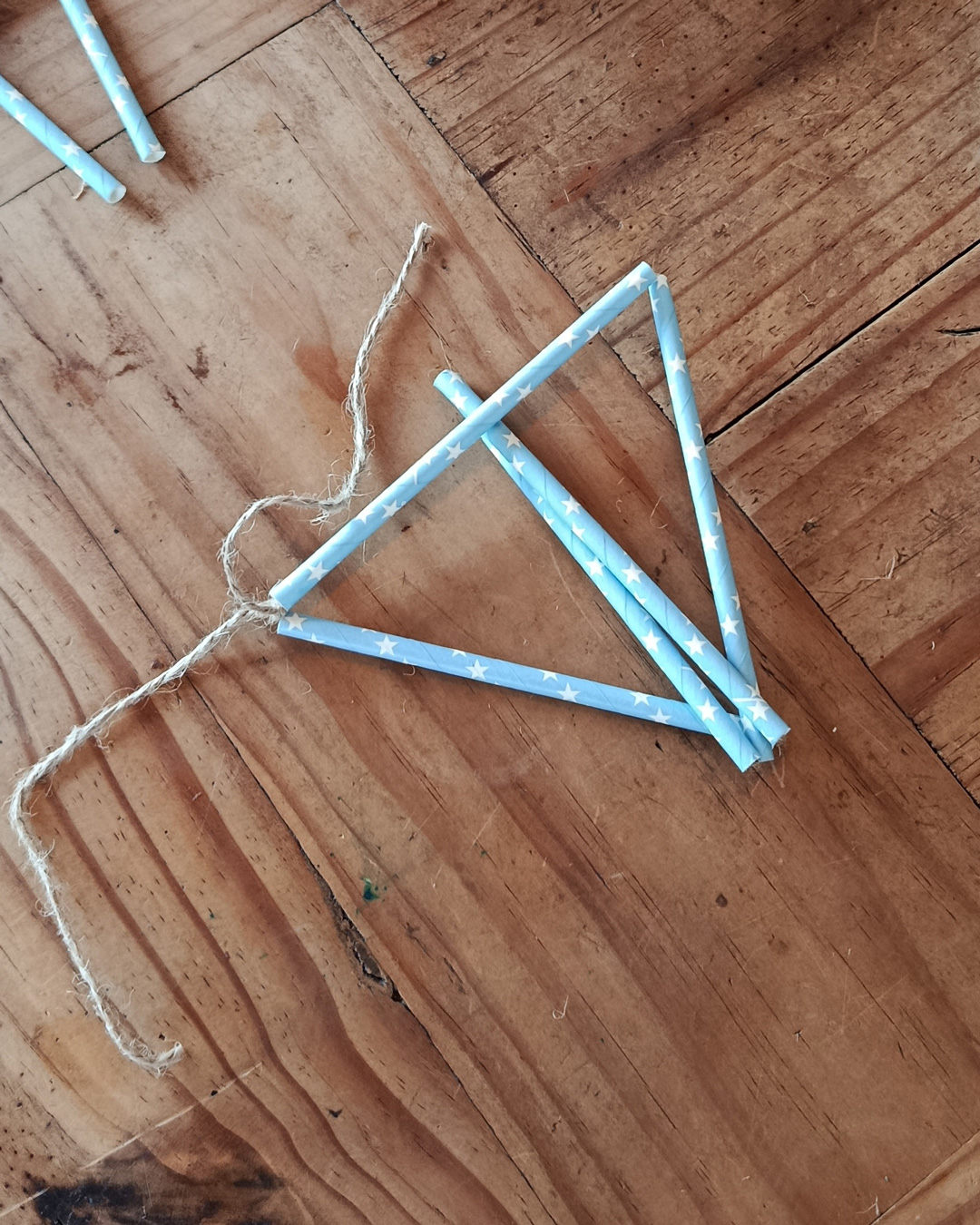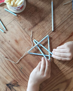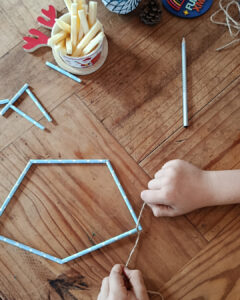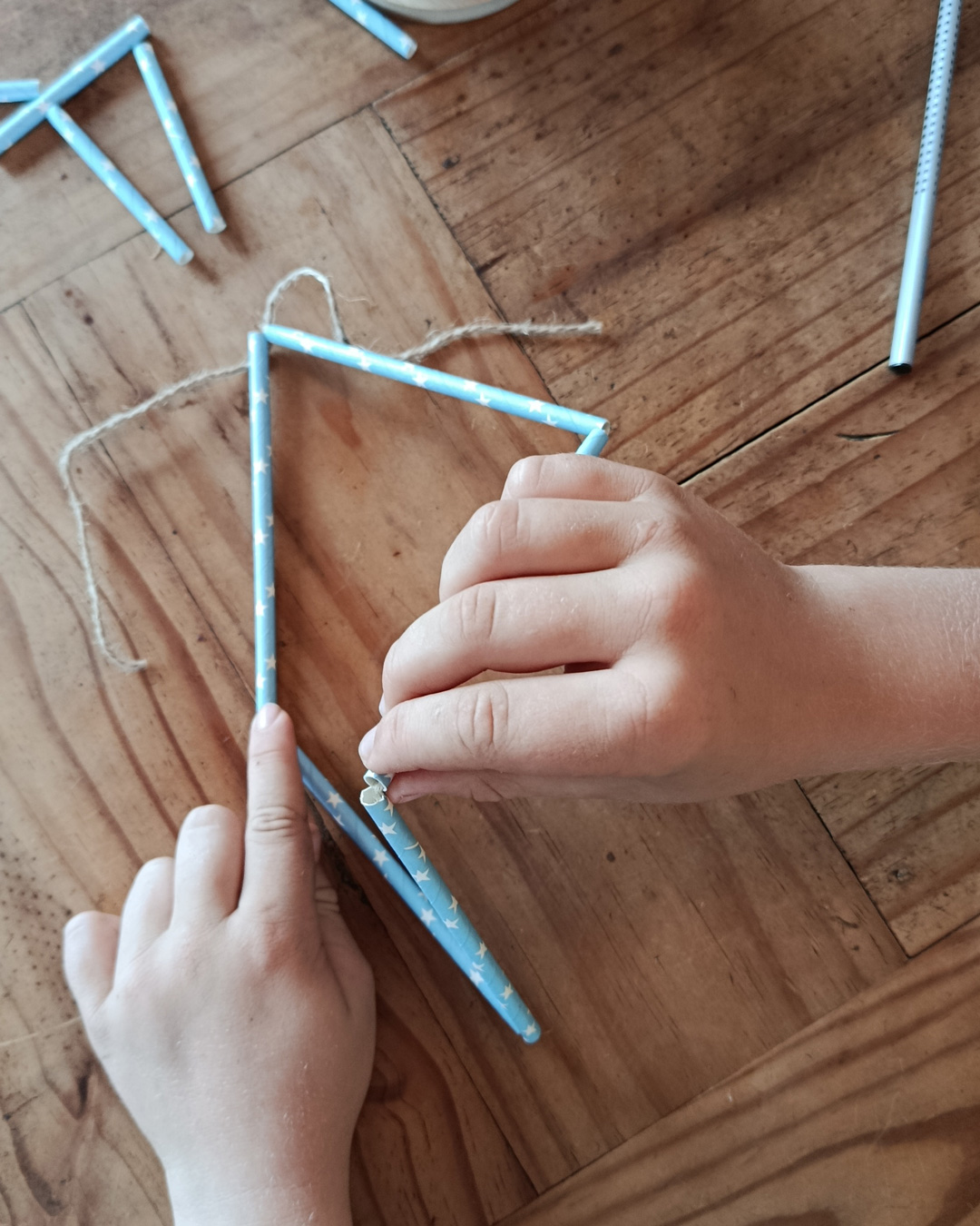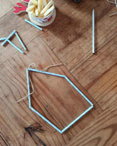 Legt nun die Halm-Kette wie ein kleines Haus mit Dach vor euch auf den Tisch. Nehmt dann die rechte untere Ecke vom Haus und legt sie über die linke obere Ecke. Es entsteht nun oben ein Dreieck und unten eine Form, die an den Griff eines Teesiebes erinnert.