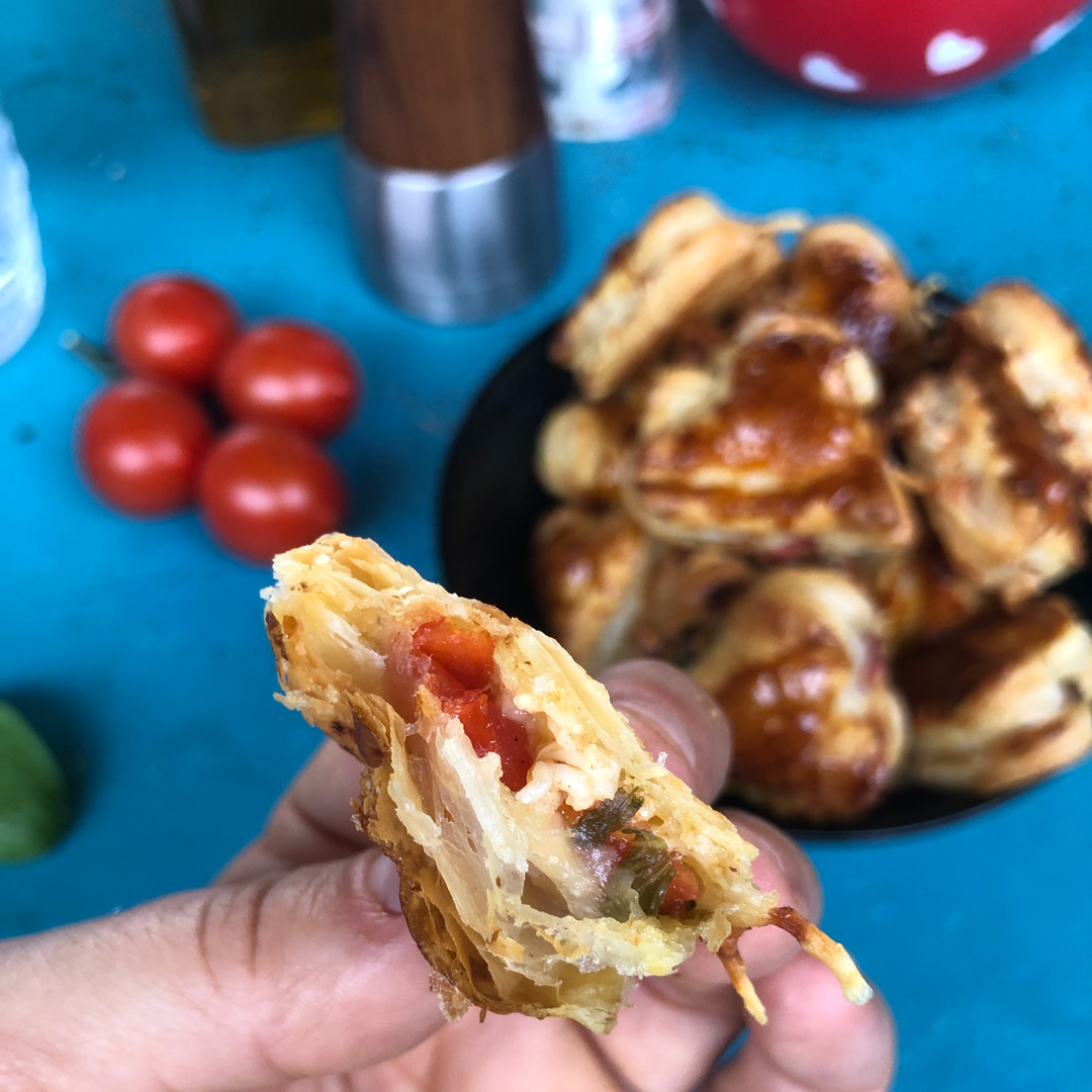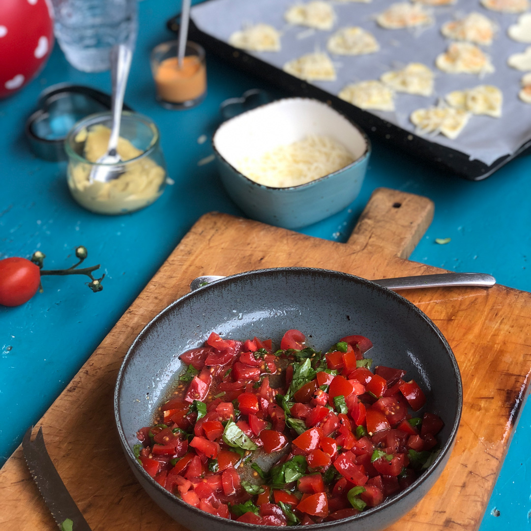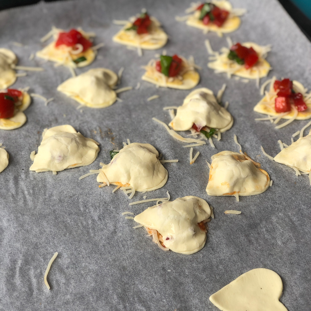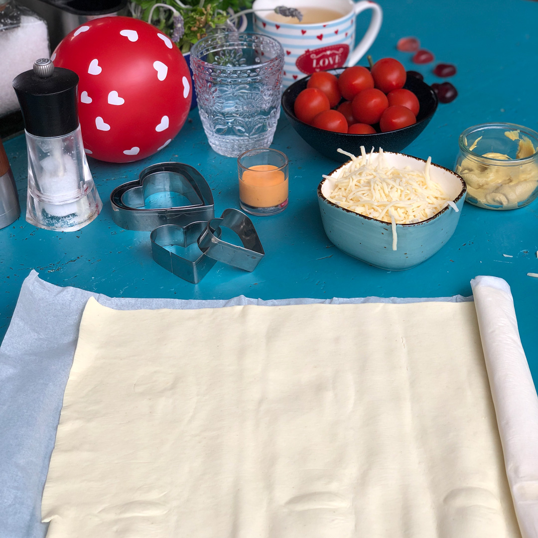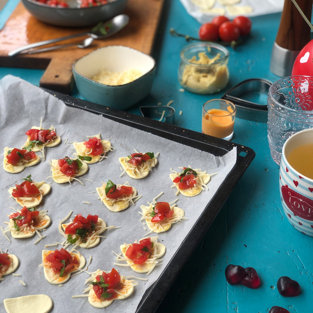 Den Blätterteig ausrollen und den Teig mit der Herzchenform ausstechen. Wer zwei unterschiedlich große Formen hat, sticht die gleiche Anzahl große und kleine Herzen aus dem Teig. Die kleinen Herzen bilden den Boden, auf dem der Tomaten-Basilikum-Belag gelegt wird. Mit den großen Herzen wird die Füllung zugedeckt.