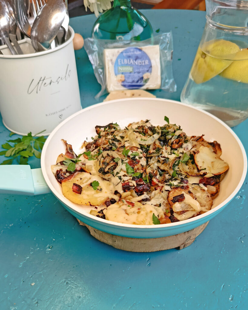 Nun die Zwiebelwürfel über die Kartoffeln streuen, aber zunächst nicht umrühren. Die Pfanne abdecken und die Kartoffeln nach 5 Minuten vorsichtig wenden. Jetzt für weitere 5 Minuten braten lassen.