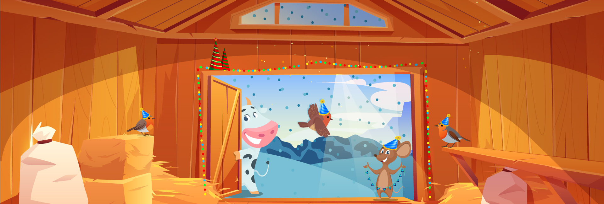 Auch bei den Tieren glitzert es heute. Im Stall leuchten bunte Lichter. Sie machen es hell und warm. Die Tiere beobachten schon eine ganze Weile, wie der Bauer große Lichterketten am Tor, an den Fenstern, im Gebälk und quer durch den Stall aufhängt. Der Bauer kümmert sich immer liebevoll um seine Tiere, fast so, als wären es seine Kinder. Deshalb fühlen sie sich bei ihm pudelwohl. Auch Thea und Mila sitzen dicht beieinander im Stroh. Sie sind ganz beseelt von Liebe und Lichterglück und schauen, was passiert.